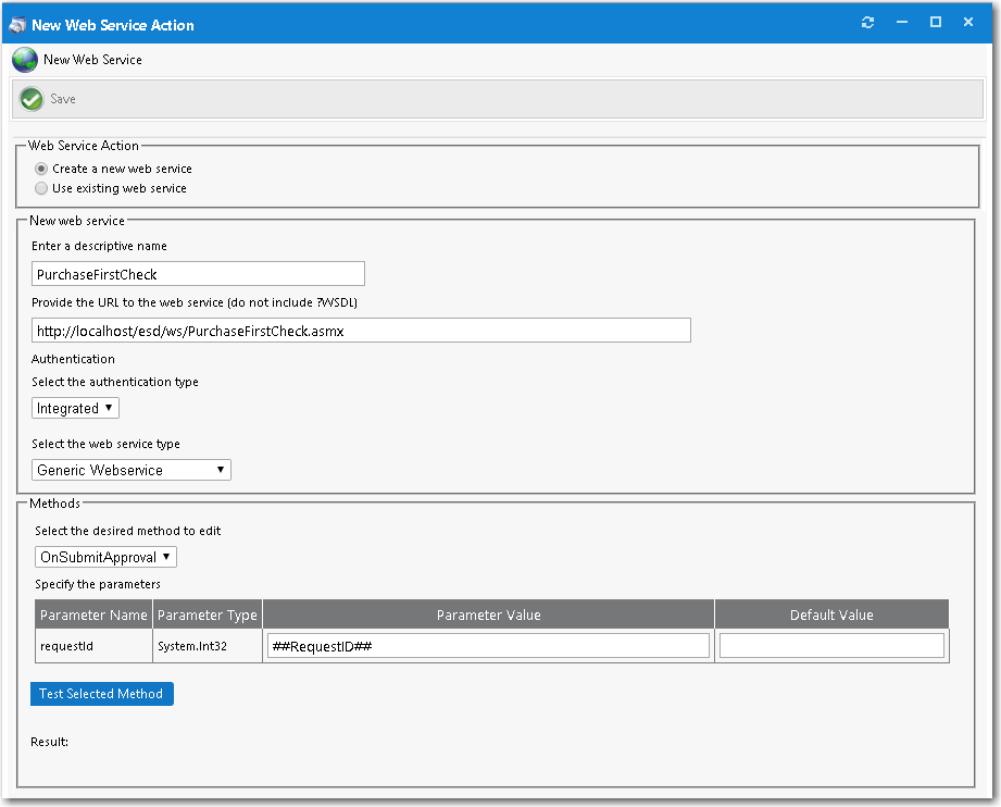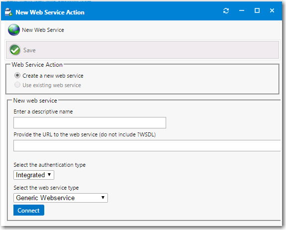 New Web Service Action Dialog Box / Create a New Web Service / Connected