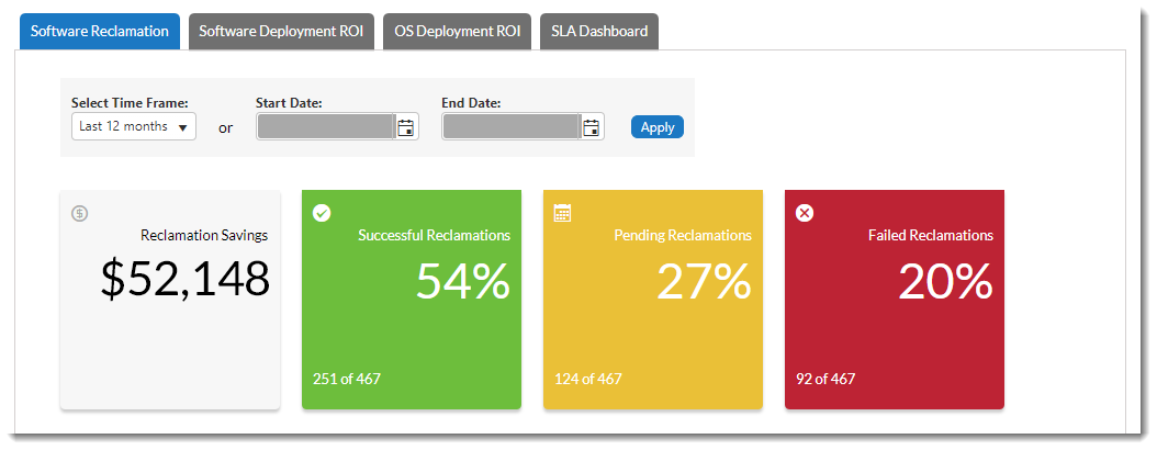 The Software Reclamation Savings dashboard displays reclamation savings over a specified time frame. To change the time frame, use the Select Time Frame drop-down list or the Start Date and End date fields and click Apply as described in Choosing Time Frame for Graph Data.
