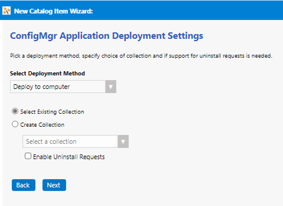 If you are adding an application from ConfigMgr, perform the following steps on the ConfigMgr Deployment Settings panel when Enable selection of existing collection when creating/editing a catalog is disabled: