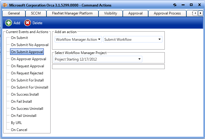 On Submit Approval). - From the Select a service list, select Workflow Manager Action. Automatically, Submit Workflow will be selected from the Select a method or command list.