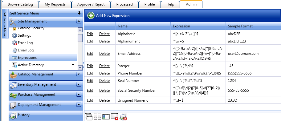 On the Admin tab, open the Expressions subview of the Site Management view. The Expressions view opens, listing all defined expressions.