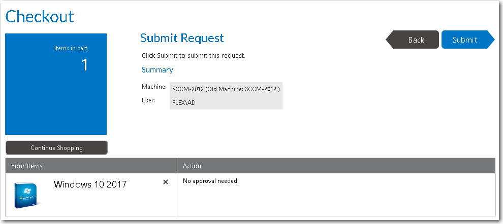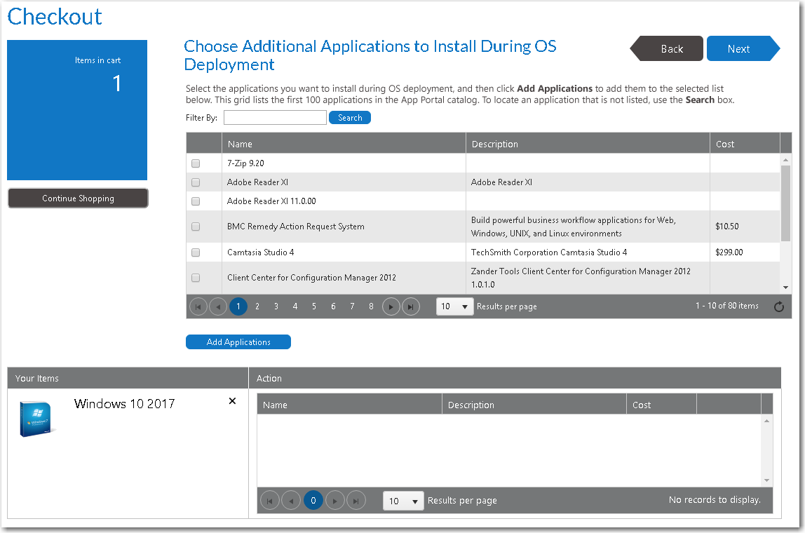 1. On the Browse Catalog tab, locate an OS deployment task sequence catalog item for the operating system you desire, and click Add to add it to your cart. The Choose Target panel of the Checkout Wizard opens.