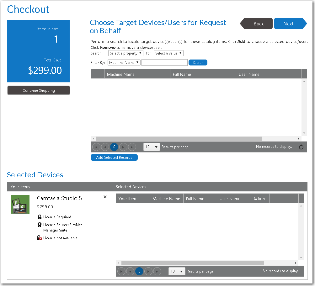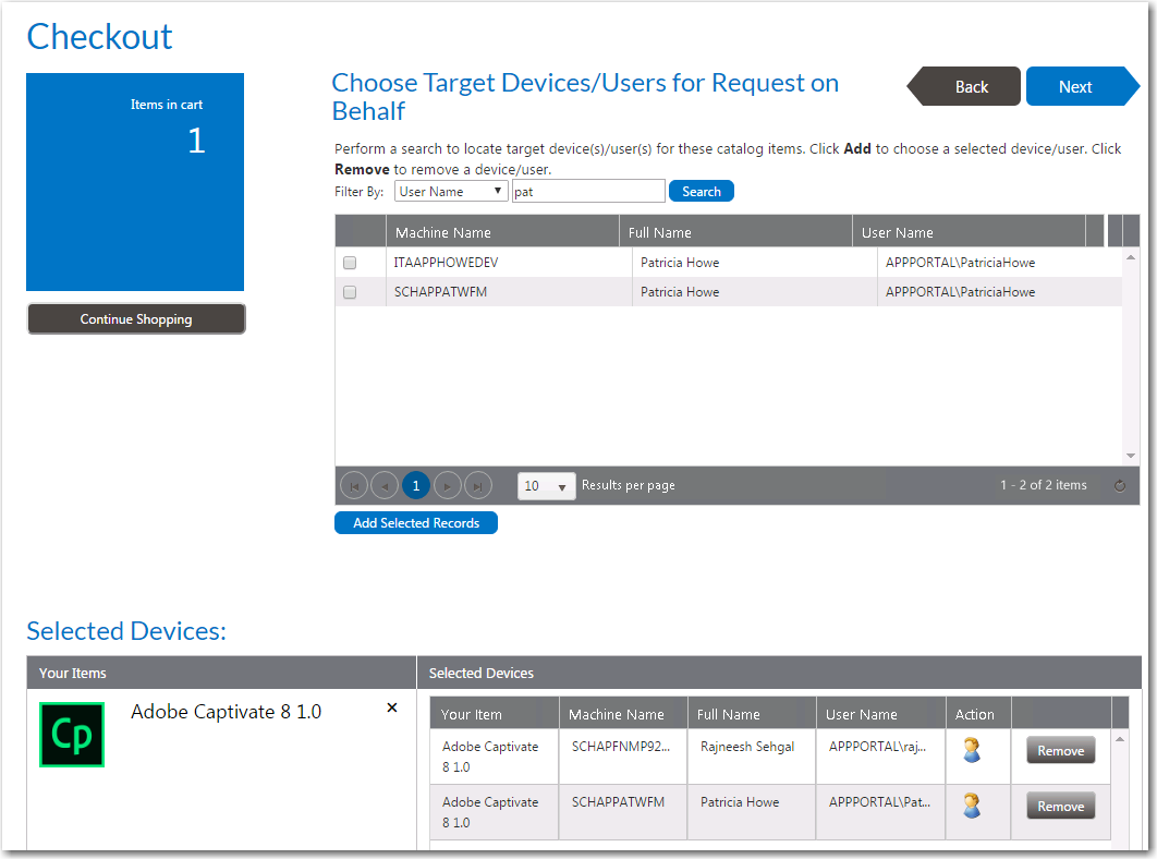 On the Choose Target panel of the Checkout Wizard, select Search for people or computers, as described in Choosing a Target or Target Option, and click Next. The Choose Target /Users for Request On Behalf Panel panel opens.