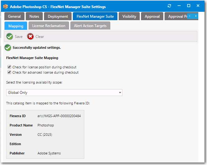 Click Save. The catalog item is now mapped to a software entry in FlexNet Manager Suite, and the product information is now listed at the top of the dialog box.